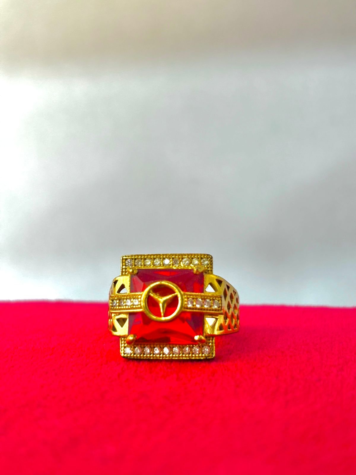 Iconic Centerpiece: Features a large, radiant red stone with a distinctive gold symbol overlay, giving it an exclusive, custom feel.